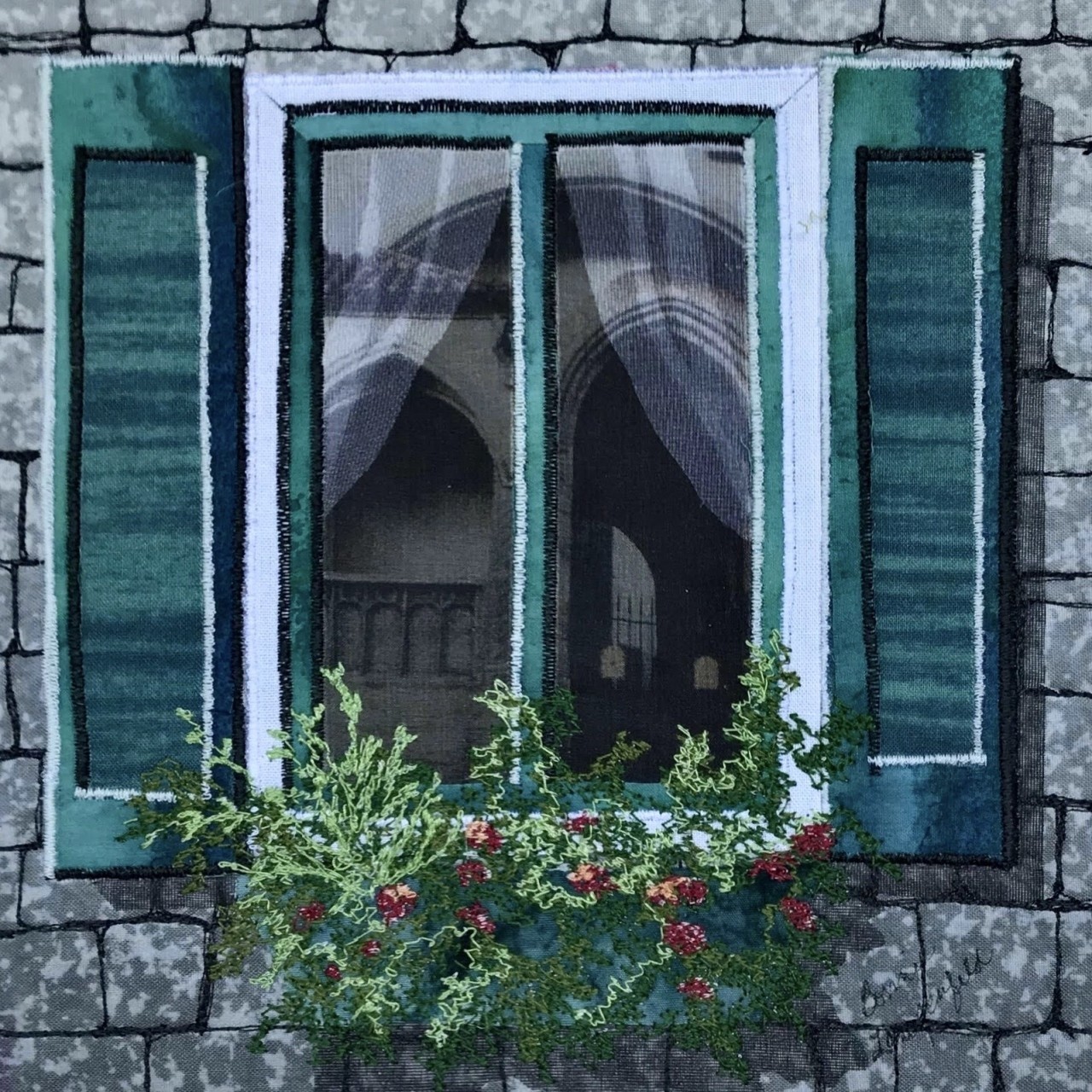 Create a beautiful window complete with a reflection, sheer curtain, and lush window box set in a old stone wall. It is all done simply in raw edge appliqué and Bonnie's own thread sketching techniques. Additionally, highlights and shadows are used to bring the image to its full illumination. Finished size is 8x10", suitable for framing.